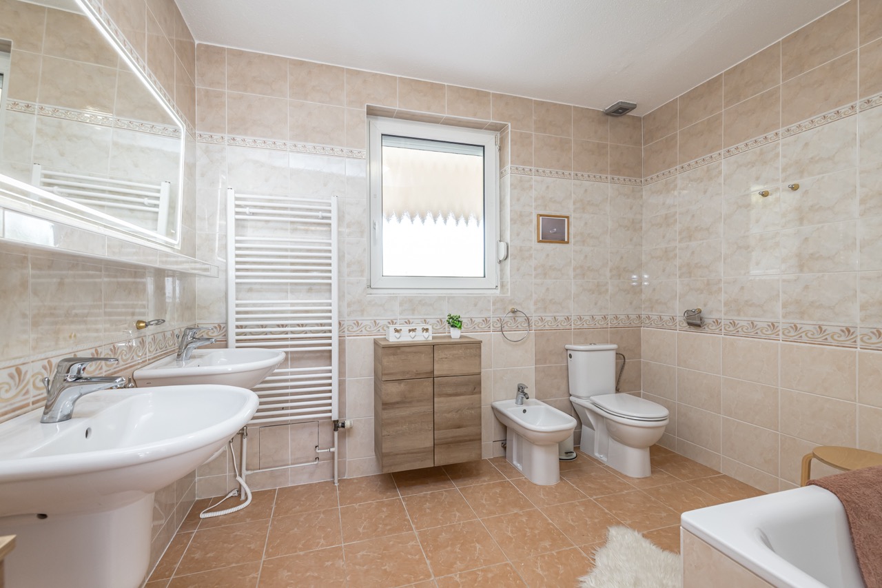 Dům nabízí pět obytných místností – hlavní ložnici, dětské pokoje, pracovnu či pokoj pro hosty... je to jen na vás. Dvě koupelny, každá s vlastní toaletou, zajišťují maximální pohodlí. A pak je tu šatna s přípojkou na pračku – možná nevšední detail, ale v každodenním životě k nezaplacení.